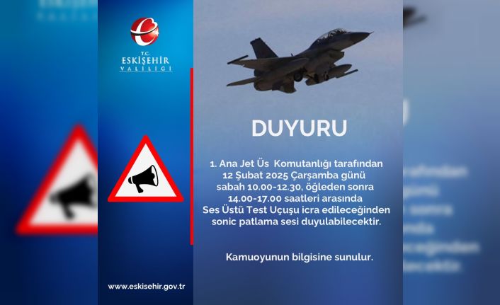 Eskişehir Valiliği, duyuruyu resmi sosyal medya hesapları üzerinden yayımlandı. Açıklamada, 12 Şubat 2025 tarihinde 1. Ana Jet Üs Komutanlığı tarafından 10.00-17.00 saatleri arasında ses üstü test uçuşu gerçekleştirileceği belirtildi. Ayrıca, sonic patlama sesi duyulabileceği konusunda uyarı yapıldı.