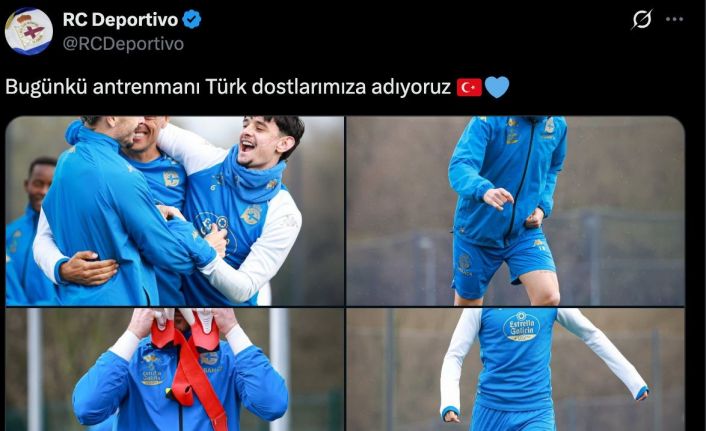 Türkiye ile İspanya arasındaki dostluk, son günlerde sosyal medyada gündem oldu. Bu konuyla ilgili bir paylaşım da İspanya 2. Lig takımlarından Deportivo’dan geldi. Deportivo resmi sosyal medya hesapları üzerinden Türkçe olarak ’Bugünkü antrenmanı Türk dostlarımıza adıyoruz’ paylaşımı yaptı. Eskişehirspor tarafı ise bu paylaşımı alıntılayarak, iki ülkenin bayraklarının kullandığı paylaşımla cevap verdi.
