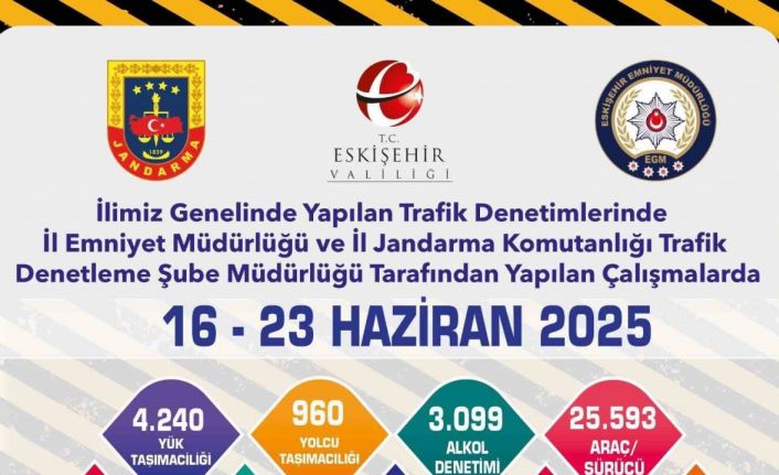 Eskişehir İl Emniyet Müdürlüğü ve İl Jandarma Komutanlığı Trafik Denetleme Şube Müdürlüğü’nce 16-23 Haziran tarihlerinde çeşitli trafik denetimleri gerçekleştirildi. Yapılan çalışmalar kapsamında; 4 bin 240 yük taşımacılığı, 960 yolcu taşımacılığı, 25 bin 593 sürücü ve bin 657 adet motosiklet denetlendi. Ayrıca 3 bin 99 alkol denetimi, 6 bin 957 emniyet kemeri denetimi ve 8 bin 680 diğer kontrol türlerinde denetimler yapıldı. Çalışmalar çerçevesinde toplam 265 araç trafikten men edildi ve 7 bin 10 adet trafik cezası kesildi, 89 sürücü belgesine ise el konuldu.
