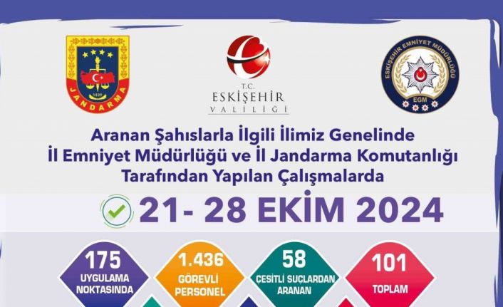 Eskişehir’de polis ve jandarma ekiplerince 175 farklı uygulama noktasında gerçekleştirilen çalışmalarda, çeşitli sürelerde hapis cezası bulunan 43 şahıs ile aranma kaydı bulunan 58 şüpheli yakalandı.