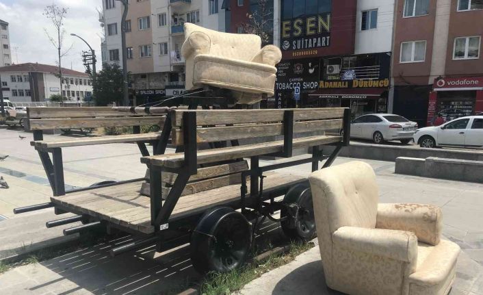 Tepebaşı ilçesi Hatboyu-1 Caddesi’ne süs amacıyla bırakılan küçük yük vagonu değişik manzaralara sahne oldu. Vagonun üzerine ve önüne bırakılan 2 adet tek kişilik koltuk dikkat çekti. Kimliği belirsiz kişiler tarafından bırakılan koltuklar görenleri şaşırttı. Özellikle vagonun üzerine sabitlenen koltuk ise ilginç görüntüler oluşturdu. Çevrede yaşayan vatandaşlar gördükleri manzara karşısında şaşkınlığını gizleyemedi.