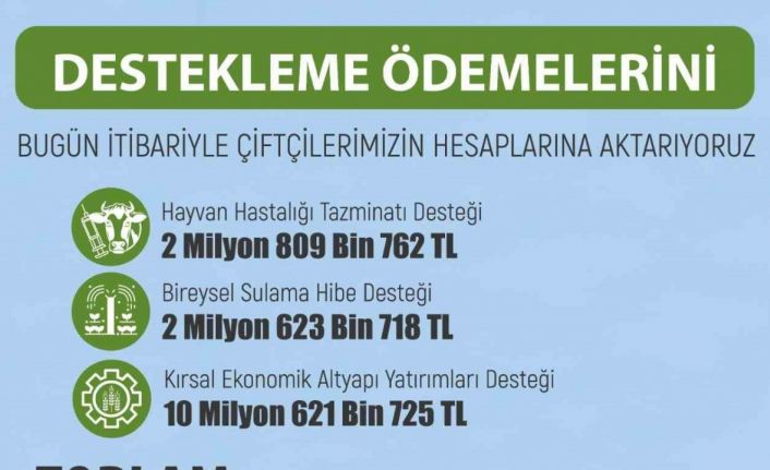 Eskişehir İl Tarım ve Orman Müdürlüğü tarafından Hayvan Hastalıkları Tazminatı Desteği, Bireysel Sulama Sistemleri Desteği ve Kırsal Ekonomik Altyapı Yatırımları Desteği kapsamında toplamada 16 Milyon 55 Bin 205 TL destek üreticilerin hesabına yatılacağı açıklandı.
