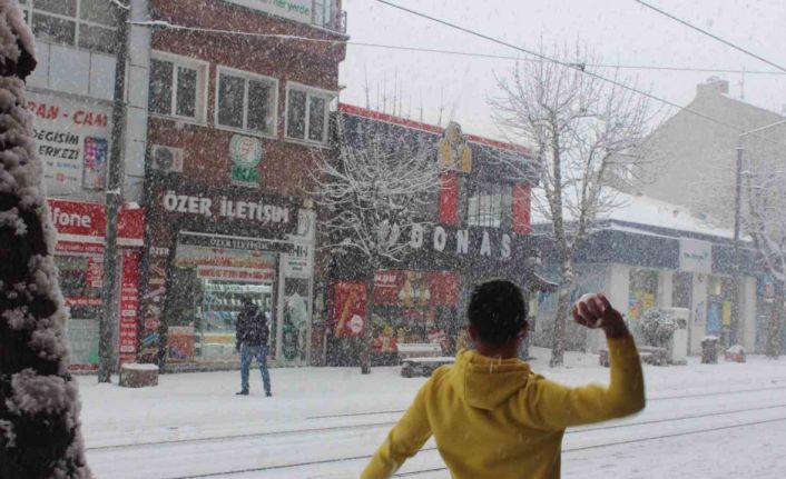 Sabah saatlerinde Eskişehir’i etkisi altına alan yoğun kar yağışı şehir üzerine adeta beyaz örtü serdi. Güzel manzaralar oluşan şehirde esnaf birbirleriyle kartopu savaşı yaptı.