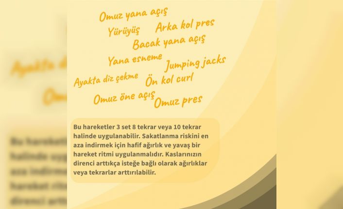 Güvenli sosyal mesafeyi korumak adına evde kalması gereken bugünlerde, hareketsiz bir yaşam tarzı da ister istemez insan yaşantısına iş, eğlence ya da eğitim amaçlı olarak dijital dünyada daha fazla zaman geçirdiği bu süreçte, ara vermemek, egzersiz yapmamak vücudunda çeşitli fiziksel sorunlara neden olabiliyor. Bu noktada, Anadolu Üniversitesi evde yapılabilecek bazı basit spor egzersizleri öneriyor. Bu egzersizleri düzenli şekilde uygulayarak kalp ritminizi dengede tutabilir, bağışıklık sisteminizi daha güçlü kılabilir ve gün içinde kullandığınız kaslarınızı çalıştırarak formdan düşmeyi engelleyebilirsiniz.