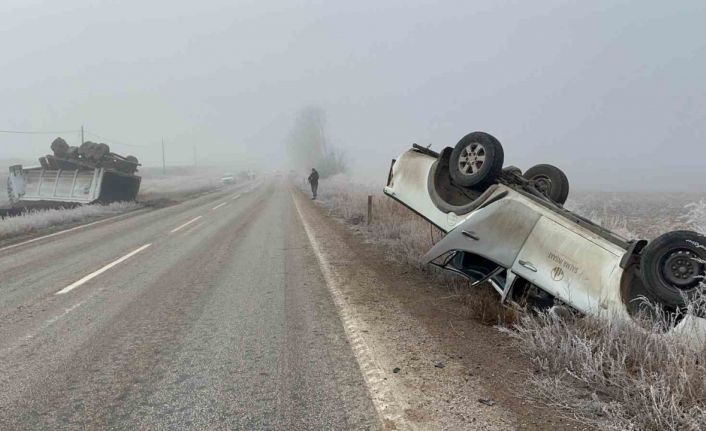 Eskişehir’de kömür yüklü kamyonu sollamaya çalışan kamyonet, gizli buzlanma nedeniyle kontrolden çıktı. Her 2 aracın şarampole devrildiği kazada 1 kişi yaralandı.