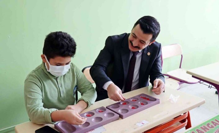 Günyüzü Kaymakamı Burak Akeller, ziyaret ettiği okuldaki bir öğrenci ile mangala oyunu oynadı, öğrencilerle zeka oyunları hediye etti.