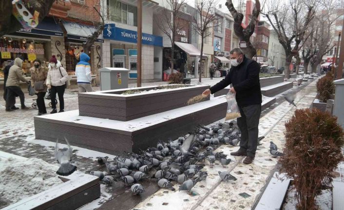 Eskişehir günlerdir dondurucu havalarla mücadele ediyor. Soğuk havalara rağmen bazı vatandaşlar, görev edindikleri duyarlı davranışlarla dikkat çekiyor. Eskişehir’de yaşayan Gökhan İmre isimli vatandaş, her gün bulgur satın alarak şehrin en işlek caddelerinden biri olan Hamamyolu’nda soğuk havalarda yiyecek bulmakta güçlük çeken güvercinleri besliyor.