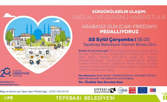 Avrupa Hareketlilik Haftası, 2002 yılından bu yana çeşitli etkinliklerle kutlananıyor. Tepebaşı Belediyesi de haftanın anlamına uygun olarak etkinlikler gerçekleştirmeye devam ediyor. Bu kapsamda 22 Eylül Çarşamba günü saat 18.00’de “Arabasız Gün - Pedallıyoruz” etkinliği, Tepebaşı Belediyesi Hizmet Binası önünde başlayacak. Bisiklet korteji Şahin Caddesi, Göknil Sokak (Polis Eğitim Merkezi önü), Temiz Sokak (Su Sporları Merkezi), Kanalboyu Sokak, Çilem Caddesi, Basın Şehitleri Caddesi, Ahmet Kanatlı Caddesi, Mustafa Kemal Atatürk Caddesi, İstasyon Caddesi, İsmet İnönü - 1 Bulvarı ve Şahin Caddesi güzergahının ardından Özdilek AVM yanındaki koruluk alanda sona erecek.