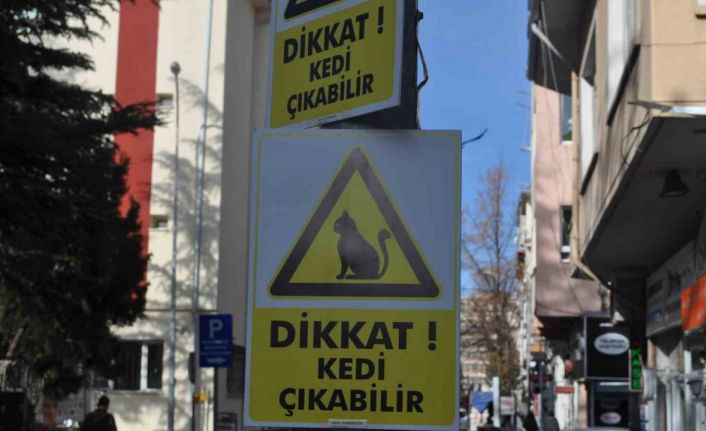 Eskişehir’deki bir ara sokakta sürücülerin çok fazla sürat yapması ve sıkça kedilere çarpması sebebiyle bölge esnafı ışık direğine “Dikkat Kedi Çıkabilir” yazısı yapıştırarak önlem aldı.