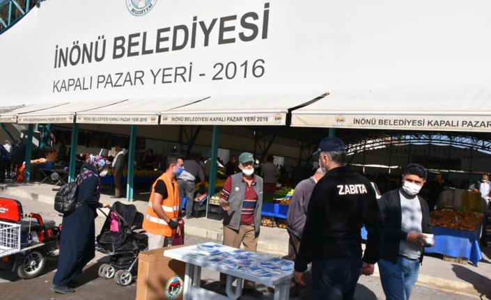 Eskişehir İnönü İlçe Belediye Başkanlığı tarafından pazaryerinde esnaf ve vatandaşlara ücretsiz çok kullanımlık maske dağıtıldı.