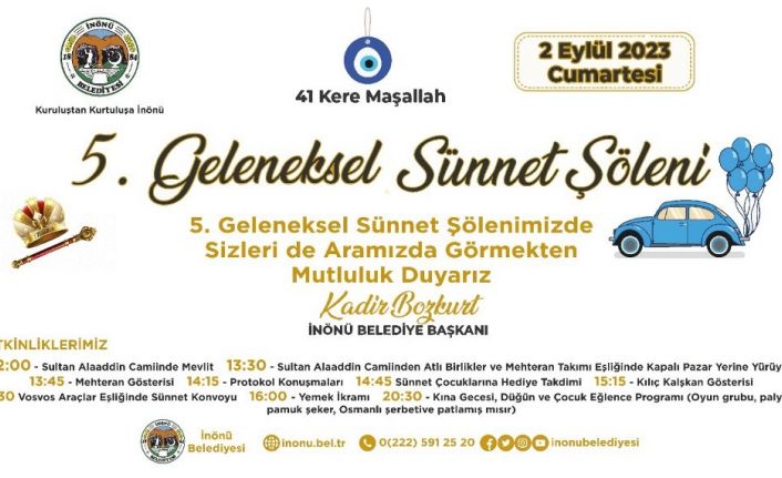 İnönü Belediye Başkanlığı tarafından 2014 yılından günümüze kadar gerçekleştirilen ve bu yıla kadar ilçede yaklaşık 500 çocuğu sünnet ettiren İnönü Belediyesi bu yıl da 17 çocuğu sünnet ettirerek, çok sayıda protokolün, ilçe halkının ve sünnet ailelerinin katılımlarıyla 2 Eylül Cumartesi günü saat 12.00’da Sultan Alaaddin Camiinde başlayacak mevlit ve İnönü Belediyesi Kapalı Pazar Yerinde akşam 20.30’da kına, düğün ve çocuk eğlence programı gerçekleştirecek. 2 Eylül Cumartesi günü kılıç kalkan, mehteran gösterisi, atlı birlikler yürüyüşü ve araç konvoyu gibi birbirinden eğlenceli etkinliklerin olacağı geleneksel sünnet şölenine isteyen herkesin katılabileceği duyurulurken, büyük organizasyona ev sahipliği yapacak olan İnönü Belediyesi 5. Geleneksel Sünnet Şöleni için hazırlıklarını aralıksız sürdürüyor.