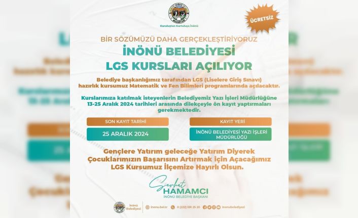 Konuyla ilgili yapılan açıklamaya göre, İnönü Belediyesi tarafından matematik ve fen bilimleri konularında LGS hazırlık kursları açılacak. Kurslara katılmak isteyenler 13-25 Aralık tarihleri arasında İnönü Belediyesi Yazı İşleri Müdürlüğü’ne müraacat ederek dilekçeyle ön kayıt yaptıracak. Çocukların başarısını arttırmak amacıyla, "Gençlere yatırım, geleceğe yatırım" diyerek bu çalışmarı gerçekleştirdiklerini belirten İnönü Belediye Başkanı Serhat Hamamcı ise, kursların hayırlı olmasını temenni etti.