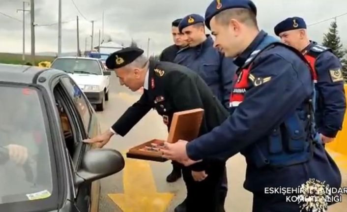 Eskişehir’de jandarma ekipleri trafik denetimlerinde durdurulan araçlardaki vatandaşlar ile bayramlaştı.