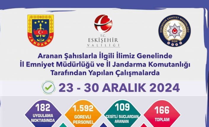 Eskişehir’de jandarma ve polis ekiplerince yapılan çalışmalar neticesinde içlerinde farklı suçlardan kesinleşmiş hapis cezası bulunan 57 kişinin de bulunduğu 166 şahıs yakalandı.