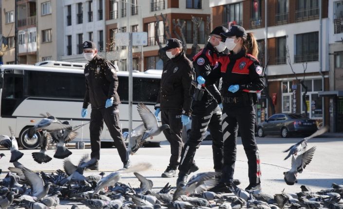 Eskişehir’de, 48 saatlik sokağa çıkma yasağı sonrası, cadde ve meydanlardaki güvercinleri polis ve bekçiler besledi.