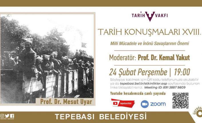 Tepebaşı Belediyesi ve Tarih Vakfı iş birliğinde, tarih bilincini artırmak amacıyla düzenlenen ve vatandaşlardan büyük beğeni toplayan Tarih Konuşmaları sürüyor. Tarihe ilgi duyan vatandaşların yoğun ilgisi ile gerçekleştirilen etkinliğin 18’incisi de koronavirüs salgını nedeniyle online olarak gerçekleşecek. “Milli Mücadele ve İnönü Savaşlarının Önemi” başlıklı Tarih Konuşmaları’nın moderatörü Prof. Dr. Kemal Yakut, konuğu ise Prof. Dr. Mesut Uyar olacak. Zoom ve Youtube üzerinden online olarak düzenlenecek söyleşiye katılmak isteyen tarih severler, etkinliğin QR kodunu ya da “tepebasi.bel.tr/etkinlikler.asp” sayfasında bulunan linki kullanabilecek.
