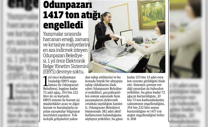 Odunpazarı Belediyesinin yazışmalar sırasında harcanan emeği, zamanı ve kırtasiye maliyetlerini en aza indirmek içim 2015 yılında kullanmaya başladığı Elektronik Belge Yönetim Sistemi (EBYS), artık Türkiye’deki tüm belediyeler tarafından kullanılacak. Çevre dostu uygulama ile diğer belediyelere örnek olan Odunpazarı Belediyesi, 5 yıl boyunca EBYS uygulaması ile yaklaşık 338 adet ağaç, 1 milyon 681 bin 837 kg/Lt su kurtardı. Ayrıca 6 bin 727 ton atık, 95 bin 304 ton karbonmonoksitin üretilmesi engellendi. Kurumsal iletişimin tamamen ağ üzerinde sürdüğü EBYS sayesinde evrakların kaybolması önlenerek dijital bir arşiv de oluşturuldu.