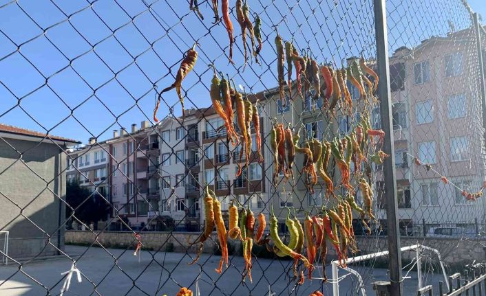 Eskişehir’de kış aylarında tüketmek amacıyla biber kurutan mahalleli, okul demirlerini kurutma işlemi için kullandı.
