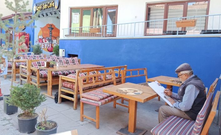 Eskişehir’de yaşayan 68 yaşındaki Ali Ünal, ilkokulda tebeşirle tahtaya resim çizerek başladığı sanatını 50 yıldır sürdürüyor ve eserlerini kafede sergiliyor.
