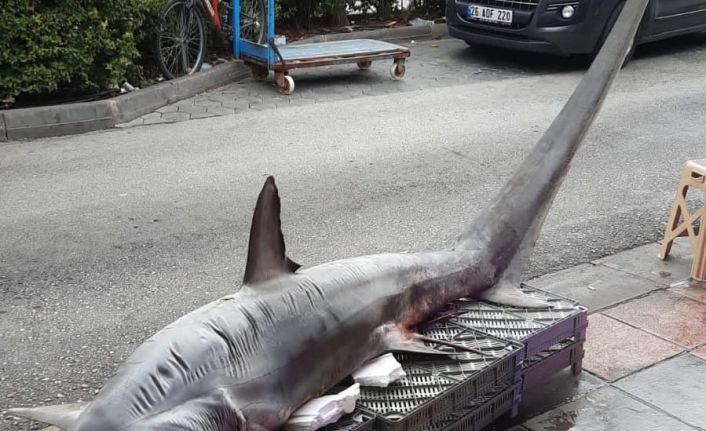 Eskişehir balıkçılar çarşısında satışa çıkarılan 476 kilogram ağırlığında ve 4 buçuk metre uzunluğundaki köpek balığı, ilgi odağı oldu.