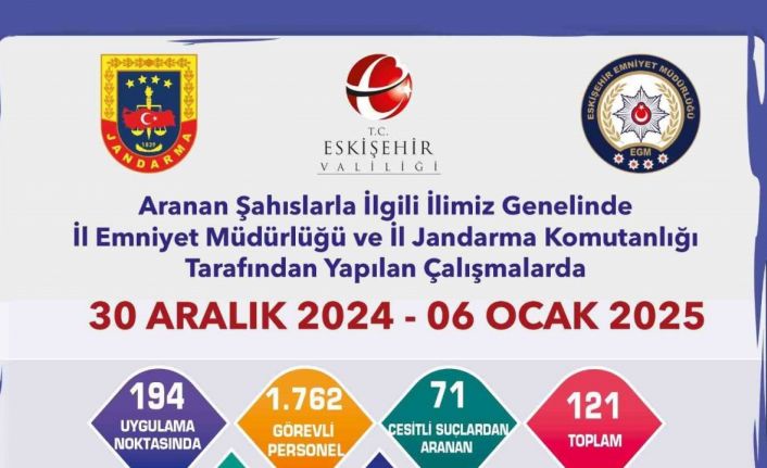 Eskişehir’de polis ve jandarma ekiplerince 194 farklı noktada yapılan denetimlerde, içinde kesinleşmiş hapis cezası bulunan şahısların da olduğu 121 şüpheli yakalandı.