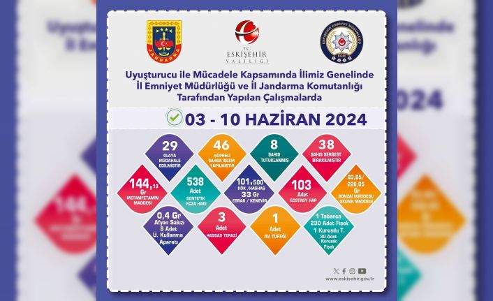 Edinilen bilgiye göre, Eskişehir İl Emniyet Müdürlüğü ve İl Jandarma Komutanlığı ekipleri tarafından, uyuşturucu ile mücadele çerçevesinde belirli tarihler arasında kent genelinde çalışma yapıldı. Bu çalışmalarda toplam 29 olaya müdahele edildi. Gerçekleştirilen operasyonlar sonucunda 46 şahsa işlem yapılırken, 8 şüpheli tutuklandı ve 38 şahıs serbest bırakıldı. Yapılan aramalarda ise 144,19 gram metamfetamin, 538 adet sentetik ecza hapı, 101 bin 500 kök haşhaş, 33 gram esrar, 103 adet ecstasy hap, 83,85 gram bonzai, 228,85 gram skunk, 0,4 gram Afyon sakızı, 8 adet uyuşturucu kullanma aparatı, 3 adet hassas terazi, 1 adet av tüfeği, 1 tabanca, 230 adet fişek, 1 kurusıkı tabanca ve 30 adet kurusıkı fişek ele geçirildi.