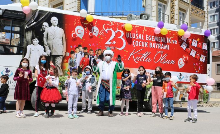 Eskişehir Sivrihisar Belediyesi, pandemi nedeniyle uygulanan sokağa çıkma kısıtlamasında 23 Nisan Ulusal Egemenlik ve Çocuk Bayramı için hazırladığı bayram otobüsü ile sokak sokak gezerek çocuklara hediye dağıttı.