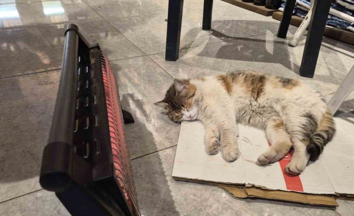 Eskişehir’de soğuktan üşüyen bir sokak kedisi, ısınmak için sığındığı bakkal dükkanında elektrikli ısıtıcının karşısına geçip uyudu.