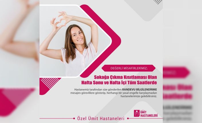Özel Ümit Hastaneleri tarafından yapılan açıklamada; sokağa çıkma kısıtlaması olan zaman dilimlerinde hastaların sağlık hizmetine ulaşabilmesi için hastane tarafından gönderilen randevu bilgilendirme mesajının gösterilmesinin yeterli olacağı belirtildi.