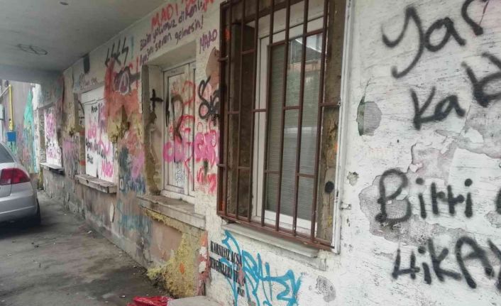 Bir binanın üzerine yazılan anlamsız yazılar, şekiller sokakta çirkin görüntülere sebebiyet veriyor.