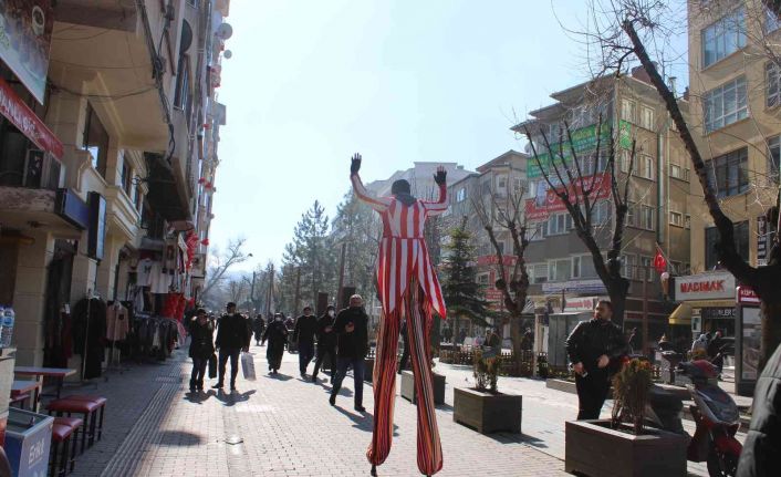 Kentin en yoğun bölgelerinden Hamamyolu Caddesi’nde takma bacaklarıyla birlikte yaklaşık 3 metreye ulaşan tahta bacaklı palyaço, görenlerin dikkatini çekti. Tahta bacaklı palyaço, kendisini ilgiyle izleyenlere el sallayarak caddenin ortasında yürüdü. Palyaçoyu görmek isteyenler işlerini bırakıp telefonlarıyla görüntü almaya çalıştı. Özellikle çocukları peşinde koşturan animatörün ilginç görüntüsü, çarşıda alışveriş yapanların dikkatini toplamayı başardı.