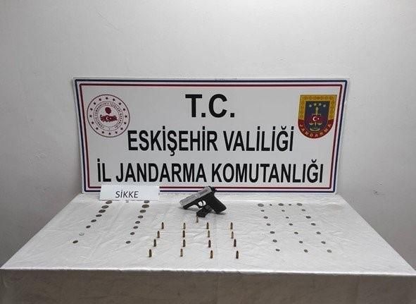 KOM Şube Müdürlüğü ve Seyitgazi İlçe Jandarma Komutanlığı ekiplerince şüpheli şahıslara ait araçta yapılan aramada, Roma ve Bizans dönemine ait 40 adet gümüş sikke, 1 adet ruhsatsız tabanca, 1 adet şarjör, 17 adet dolu fişek ele geçirildi.