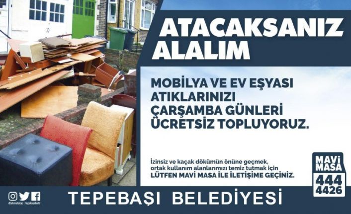 Tepebaşı Belediyesi Temizlik İşleri Müdürlüğü’ne bağlı ekipler, 444 44 26 numaralı telefondan Mavi Masa’ya ulaşan vatandaşların, kül ve cüruf atıklarından, mobilya, ev eşyası ve tadilat atıklarına kadar her türlü atığı gelen talepler doğrultusunda evlerinden teslim alıyor. Ekipler kül ve cüruf atıklarını her gün, mobilya ve ev eşyası atıklarını çarşamba günleri ve 5 çuvala kadar ücretsiz olmak üzere 50 çuvala kadar olan tadilat atıklarını da salı ve çarşamba günleri topluyor. Temizlik hizmetlerinden faydalanmak ve konu hakkında bilgi almak isteyen vatandaşlar, 444 44 26 numaralı telefondan Mavi Masa’ya ulaşabiliyor.