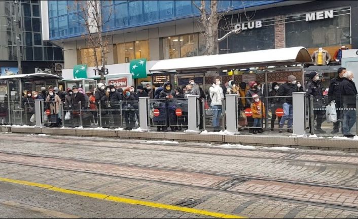 Eskişehir’deki tramvay durağında rastlanan sosyal mesafeden uzun bildik kalabalık görüntüler hayrete düşürürken, inen ve binenler arasından gerçekleşen temasın virüsün yayılmasına sebep olabileceği adeta unutuldu.