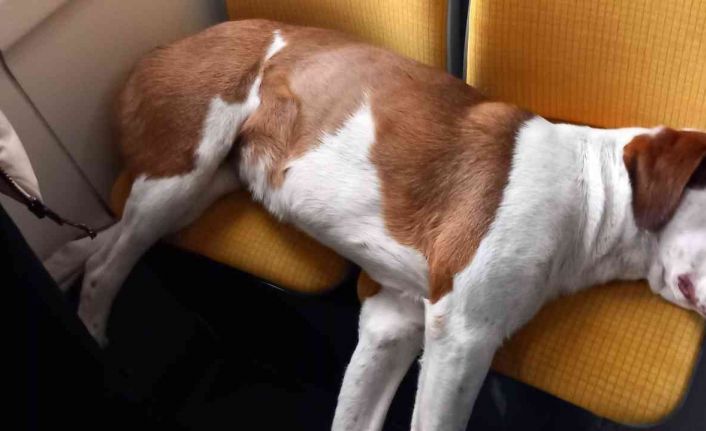 Eskişehir’de soğuktan korunmak için tramvaya binen sevimli köpek, iki kişilik tramvay koltuğunda yatarak uyudu ve kendisini rahatsız etmeyen yolcuların ilgi odağı oldu.