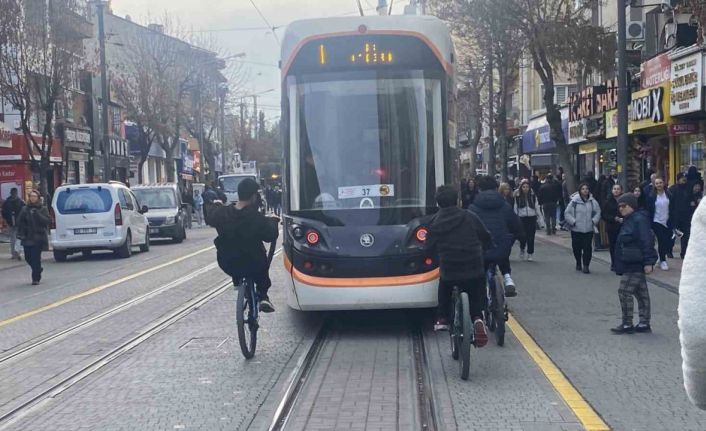 Eskişehir’de 3 bisikletli çocuğun tramvayın arkasına tutunarak seyrettiği ve canlarını tehlikeye attığı anlar görenleri endişelendirdi.