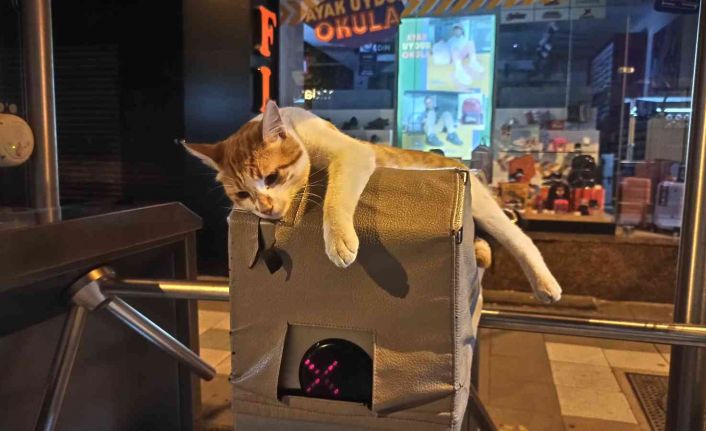 Eskişehir’in kent ulaşımının en yoğun tramvay duraklarından Çarşı durağının bilet okutulduğunda açılan turnikelere uzanan sevimli kedi, insanların ilgisine neden oldu. Tam bilet okutulan noktaya yatan kedi, onlarca yolcu geçişine rağmen rahatından ödün vermedi. Turnikeden geçen vatandaşların sevmeden geçmediği kedinin halini birçok kişi cep telefonları ile fotoğrafını çekti.