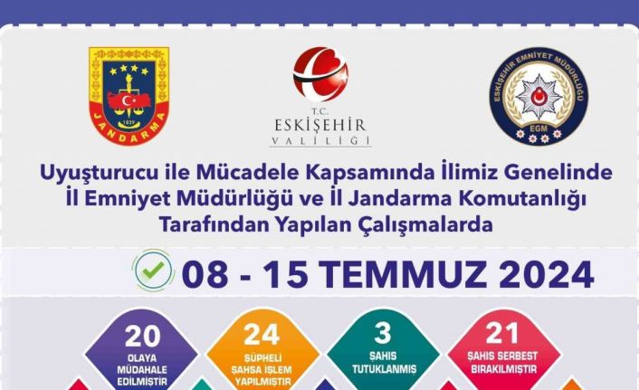 Edinilen bilgilere göre, İl Emniyet Müdürlüğü’ne ve İl Jandarma Komutanlığı’na bağlı ekipler tarafından 8 Temmuz ile 15 Temmuz tarihleri arasında uyuşturucu maddeyle mücadele çerçevesinde 20 farklı operasyon gerçekleştirildi. Yapılan operasyonlarda gözaltına alınan 24 şüpheliden 3’ü tutuklanarak cezaevine gönderildi. Ayrıca operasyonlarda yapılan aramalarda; 13,92 gram metamfetamin, 64 adet sentetik ecza hap, 22,65 gram esrar, 20 adet uyuşturucu hap, 129,98 gram bonzai ve 1 adet hassas terazi ele geçirildi.