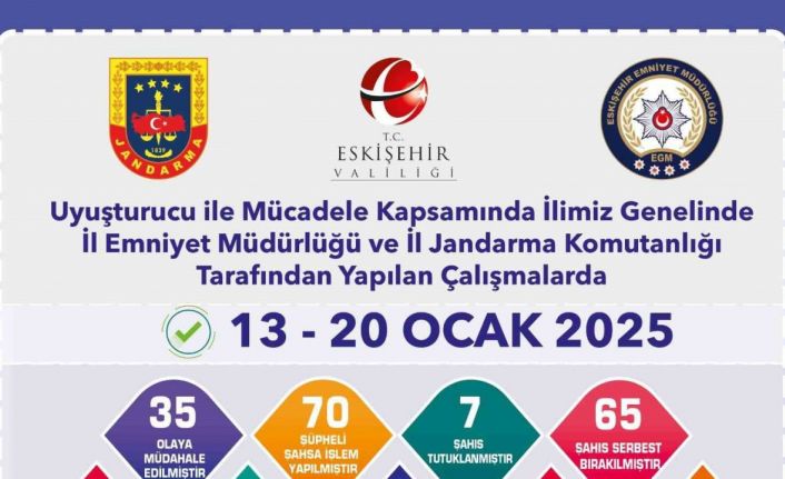 Edinilen bilgilere göre, İl Emniyet Müdürlüğü’ne ve İl Jandarma Komutanlığı’na bağlı ekipler tarafından 13 Ocak ile 20 Ocak tarihleri arasında kent genelinde 35 farklı uyuşturucu madde operasyonu yapıldı. Operasyonlarda yakalanan 70 kişiden 7’si tutuklanarak cezaevine gönderildi. Yapılan aramalarda ise 49,01 gram metamfetamin, 516 adet uyuşturucu hap, 3,28 gram esrar, 155,05 gram kokain, 325,67 gram bonzai, 1 adet hassas terazi ve 4 adet uyuşturucu kullanma aparatı ele geçirildi.