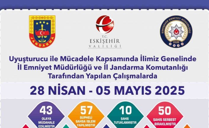 Edinilen bilgilere göre, İl Emniyet Müdürlüğü ve İl Jandarma Komutanlığı ekiplerinin uyuşturucu ile mücadele çalışmaları sürüyor. Bu çerçevede, kent genelinde 28 Nisan - 5 Mayıs tarihleri arasında çalışma yapıldı. Ekiplerin çalışmaları sonucunda 43 olaya müdahale edilirken, 57 şüpheliye işlem yapılıp, 10 şahıs tutuklandı ve 50 şahıs serbest bırakıldı. Ayrıca, 20,66 gram metamfetamin, 3 bin 768 adet sentetik ecza, 8,91 gram esrar, 1 adet uyuşturucu kullanma aparatı ve 64,91 gram bonzai maddesinin ele geçirildiği belirtildi.