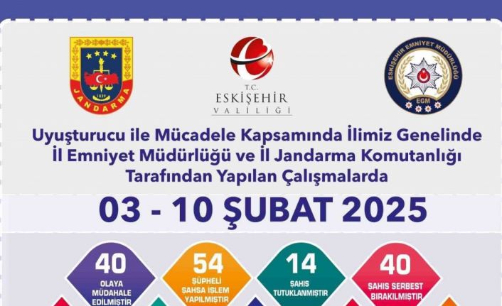 Edinilen bilgilere göre, Eskişehir İl Emniyet Müdürlüğü ve İl Jandarma Komutanlığı ekipleri tarafından uyuşturucu ile mücadele çerçevesinde çalışma yapıldı. Kent genelinde 3-10 Şubat 2025 tarihleri arasında gerçekleştirilen çalışmalarda; 40 olaya müdahale edilirken, 54 şüpheliye işlem yapılıp, 14 şahıs tutuklandı ve 40 şahıs serbest bırakıldı. Ayrıca, 11,76 gr metamfetamin maddesi, bin 118 adet sentetik ecza hapı, 125,40 gr esrar maddesi, 2 adet hassas terazi ve 79,92 gr bonzai maddesinin ele geçirildiği öğrenildi.