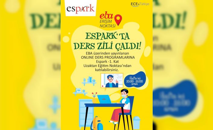 Espark Alışveriş Merkezi, uzaktan eğitime ulaşmakta sorun yaşayan öğrencileri yalnız bırakmıyor. Alışveriş merkezi içinde bulunan Uzaktan Eğitim Noktası’na velisiyle gelen öğrenciler, EBA TV üzerindeki derslerini rahatça takip edebiliyor. Hafta içi 10.00-18.00 saatleri arasında hizmet verecek Uzaktan Eğitim Noktası’nda, ilk ve orta öğretim öğrencileri bilgisayar ve internetten ücretsiz olarak faydalanabiliyor. Bu sayede öğrenci hem EBA TV’deki kayıtlı ders videoları izleyebiliyor hem de canlı derslere katılabiliyor.