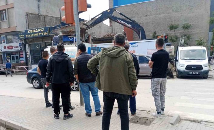 Eskişehir’de yıkım yapan bir kepçeyi gören vatandaşlar çalışmayı seyretmek için yolun karşısına geçerek kaldırımda kalabalık oluşturdu.