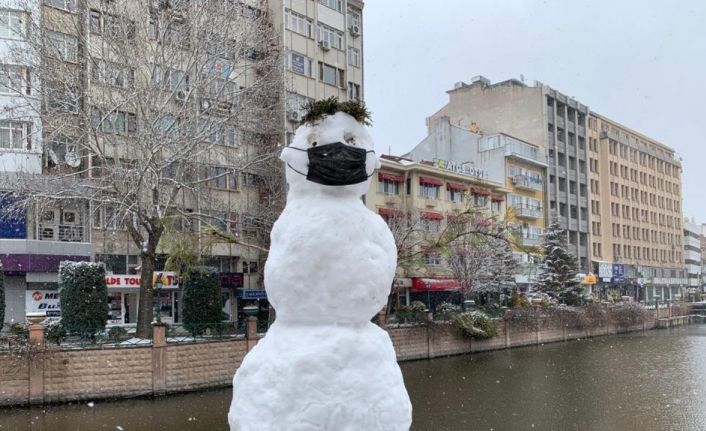 Eskişehir’de gün boyunca etkili olan kar yağışı vatandaşların yüzünü güldürdü. Kar yağışı ile birlikte vatandaşlar son dönemlerde Eskişehir’de artışını sürdüren koronavirüs vakalarına maskeli kardan adam yaparak dikkat çekmeye çalıştı. Sabah saatlerinde Porsuk Çayı kenarında görülen siyah maskeli kardan adam vatandaşlar tarafından yoğun ilgi gördü. Porsuk Çayı çevresini gezmek için yürüyüşe çıkan vatandaşlar kardan adam üzerinden yapılan göndermeden memnun olduklarını ve vatandaşların bir an önce önlemleri arttırarak vaka sayılarının düşmesini umduklarını söyledi.