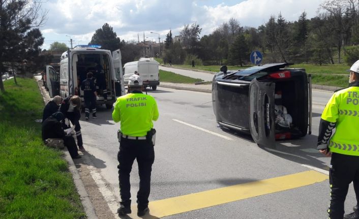 Eskişehir-Ankara çevre yolu üzerinde meydana gelen trafik kazasında, virajı alamayan sürücünün kullandığı panelvan araç orta refüjü atlayarak karşı şeride geçip yan yattı.