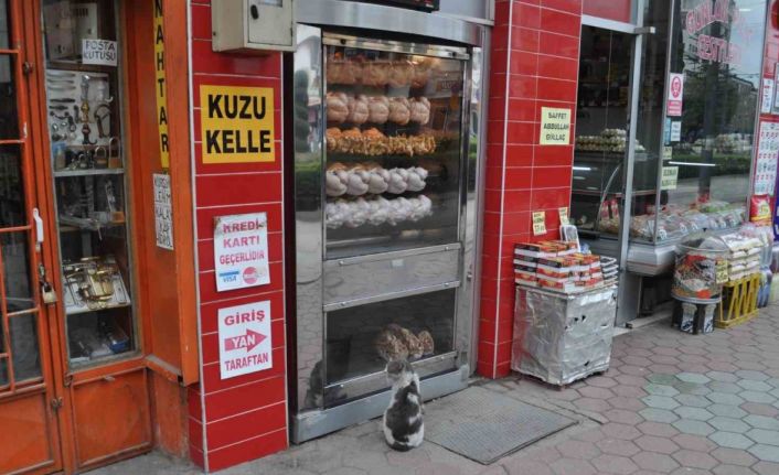 KENTİN İŞLEK BÖLGELERİNDEN BİRİ OLAN SİVRİHİSAR CADDESİNDE BULUNAN BİR KASAP DÜKKÂNININ VİTRİNİNDEKİ ETLERİ İZLEYEN KEDİ YOLDAN GEÇENLERİN GÖZÜNE ÇARPTI.