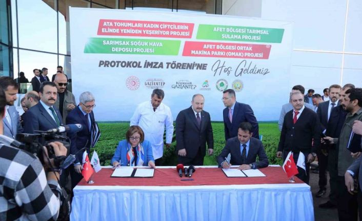 Gaziantep Büyükşehir Belediyesi, afetzede Nurdağı ve İslahiye çiftçisine sulama, alet, ekipman, kadın çiftçilere de ata tohumu desteğini içeren yaklaşık 50 milyon TL’lik 3 ayrı protokole imza attı. Sanayi ve Teknoloji Bakanlığı GAP Bölge Kalkınma İdaresi Başkanlığı iş birliğinde düzenlenen imza törenine, Bakan Mustafa Varank ve Büyükşehir Belediye Başkanı Fatma Şahin katıldı. Bu çerçevede Nurdağı ve İslahiye’deki depremzedelerin her ihtiyacına koşan Büyükşehir Belediyesi ile GAP Bölge Kalkınma İdaresi Başkanlığı iş birliğinde 23 milyon TL değerindeki “Afet Bölgesi Ortak Makine Projesi” (OMAK) için imzalar atıldı.