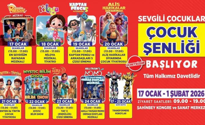 Şahinbey Belediyesi çocukların sömestir tatillerini dolu dolu geçirmeleri için 17 Ocak 01 Şubat tarihleri arasında Şahinbey Kongre ve Sanat Merkezi’nde düzenleyeceği Çocuk Şenliği’ne tüm çocukları ve aileleri davet etti.