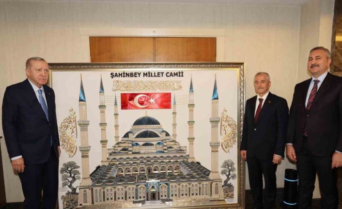 Şahinbey Belediye Başkanı Mehmet Tahmazoğlu, 2 yıl önce Cumhurbaşkanı Recep Tayyip Erdoğan tarafından açılışı gerçekleştirilen Şahinbey Millet Cami ve Külliyesi’nin özel filografi tablosunu Cumhurbaşkanı Recep Tayyip Erdoğan’a hediye etti.