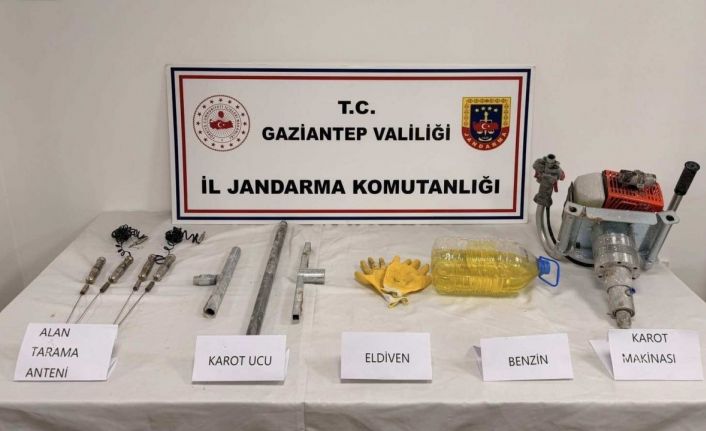 Gaziantep İl Jandarma Komutanlığı ekipleri, tarihi eser kaçakçılığının önlenmesine yönelik Gaziantep Cumhuriyet Başsavcılığı koordinesinde çalışma yaptı. Çalışma çerçevesinde, Nizip ve Şahinbey ilçelerinde icra edilen önleyici kolluk devriyesi esnasında define bulmak amacıyla izinsiz kazı yaptığı tespit edilen Ş.T., M.Ç., K.B., H.B. ve M.E. isimli şüpheliler suçta kullandıkları malzemeleri ile birlikte suçüstü yakalanarak gözaltına alındı. Yapılan aramada, 5 adet tarihi eser niteliğinde sikke, 1 adet tarihi eser niteliğinde kazan, 1 adet tarihi eser niteliğinde ibrik, 2 adet alan tarama anteni, 1 adet karot makinası, 3 adet karot makina ucu, 2,5 litre benzin ele geçirildi. Kazı malzemelerine el konularak şüpheli şahıslar hakkında yasal işlem başlatıldı.